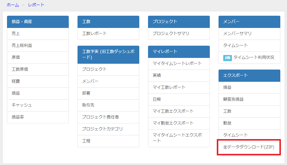 レポート>エクスポート>全データダウンロード(ZIP)にて、CSVをダウンロードする。