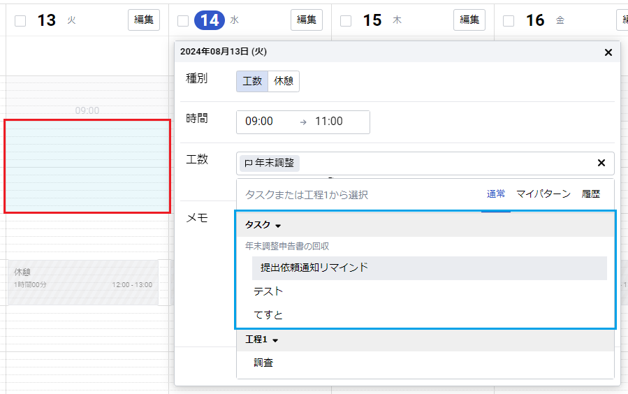 ①作業した日時をドラッグ: 工数実績を入力したい日時をマウスで選択し、