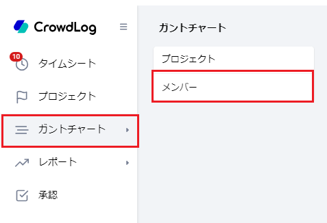 ①メニュー:ガントチャート>「メンバー」 をクリック