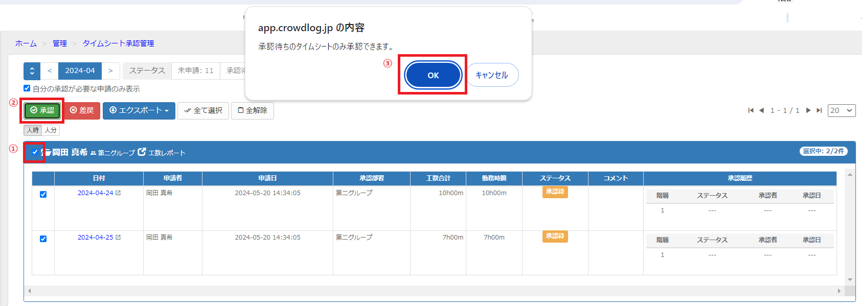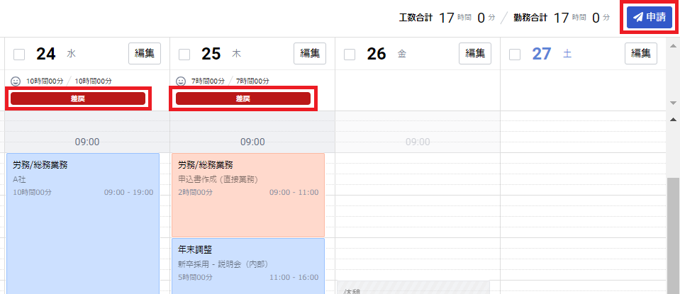 一度差戻したタイムシートを再度承認したいです。どうしたらいいでしょうか? 2025年04月18日 08:03 更新 差戻した申請については、もう一度メンバーより申請していただく必要がございます。 申請が来たものについて、管理者が承認できる流れとなります。 手順 ① 差戻しされたタイムシートを申請する タイムシート画面上部の、[ 申請 ] ボタンをクリックすると、差戻しされた日のタイムシートを申請することができます。 ② 管理者が、承認する 左メニュー>承認 より、承認する 関連記事 「承認済みのタイムシートのため編集できません」と表示されるタイムシートを編集したいです タイムシート申請 【勤怠管理】管理者が従業員の打刻データを修正することはできますか? タイムシートトップ 各メンバーの月次の工数予実を、週次で表示することは可能でしょうか?