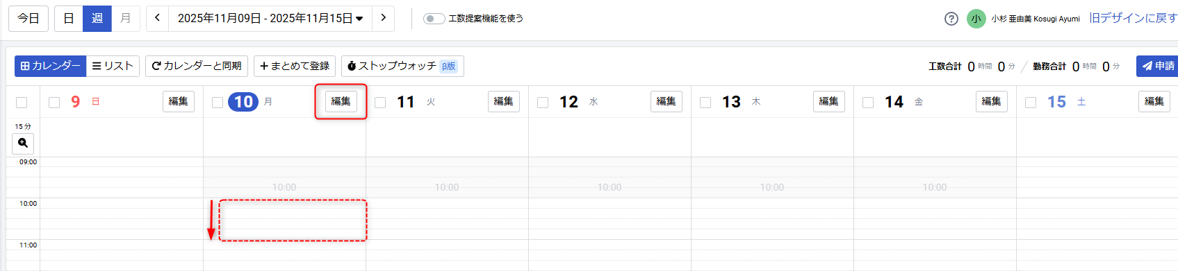 カレンダー上にて、工数登録したい日時を選択、または「編集」ボタンをクリックし、工数登録画面をします。