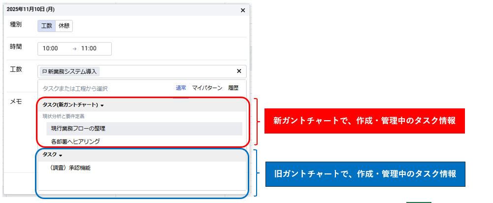 この新旧併用時、工数登録画面(タイムシート)でのタスク情報の表示は、以下の通りに区別されます。