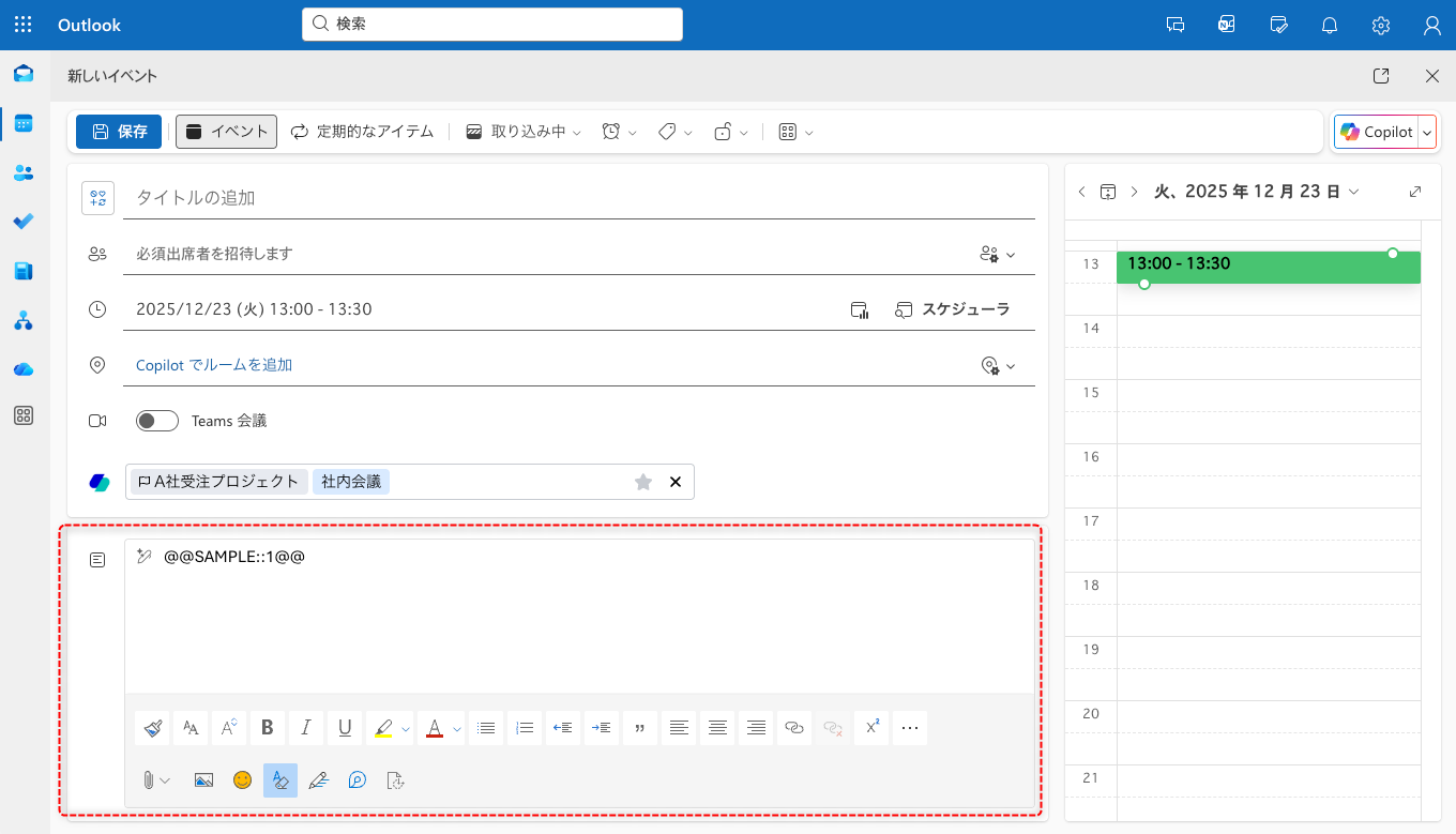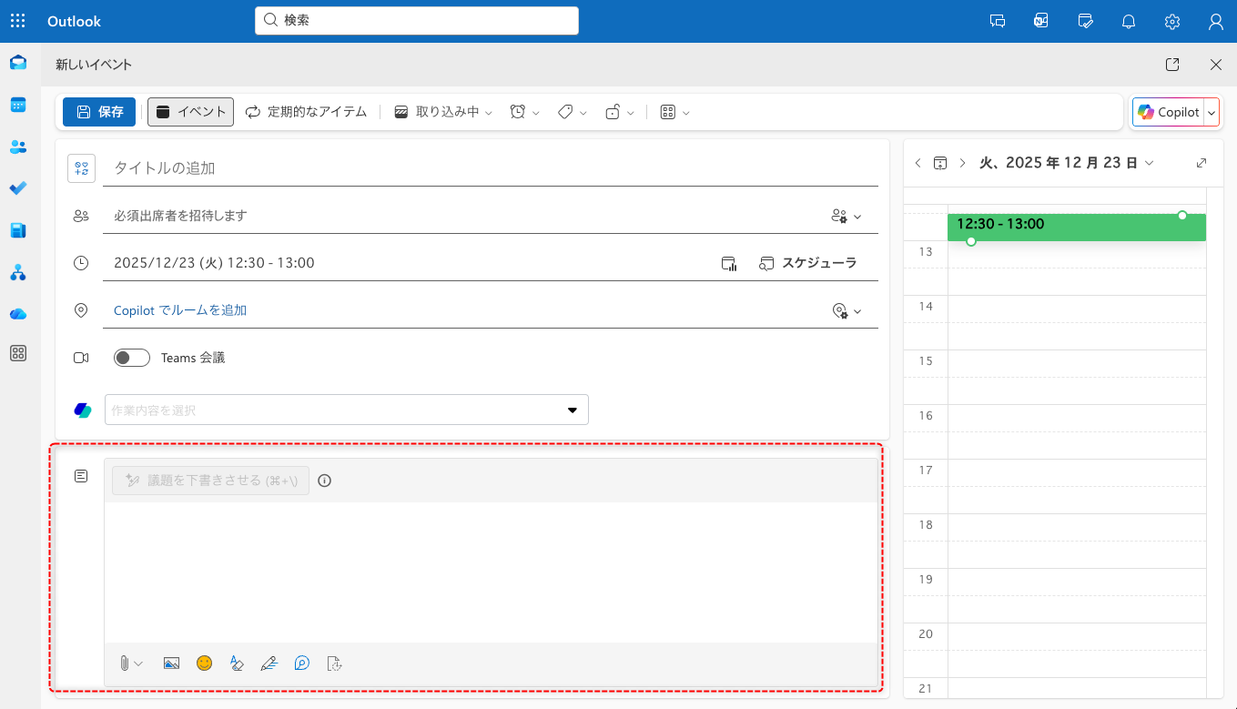 Microsoft 365 Copilotが有効な環境では、カレンダーの画面構成が通常版と異なります。