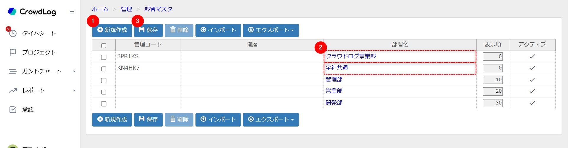 - サイドメニュー:管理 > マスタ設定 : 部署マスタをクリック