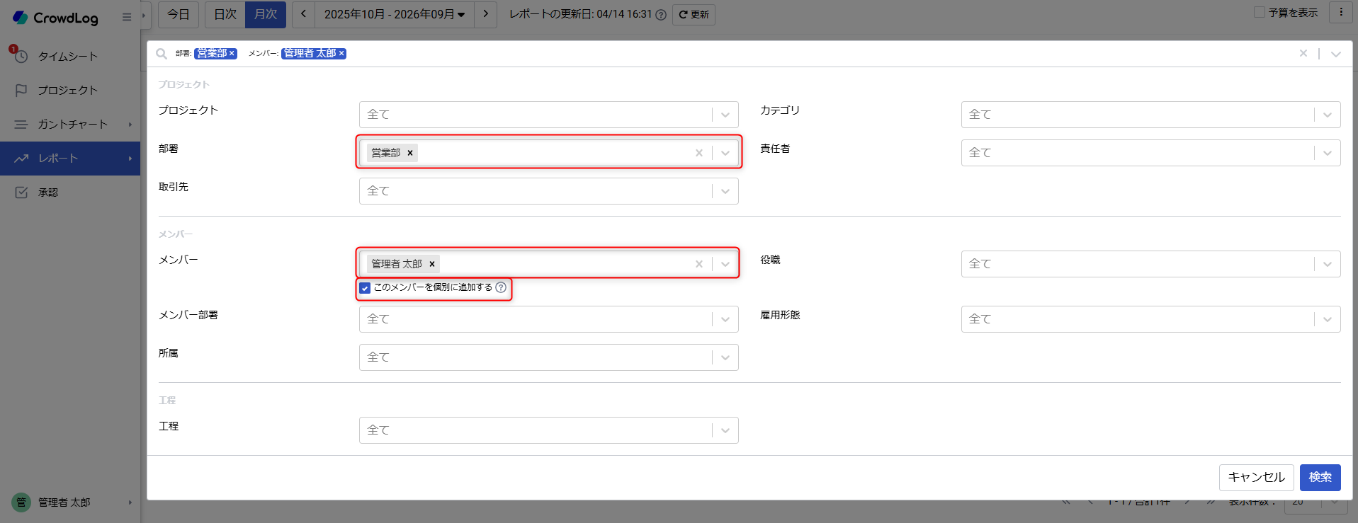 工数レポートの検索条件では、特定の「部署」や「役職」の抽出結果に対して、指定したメンバーを「個別に追加して」表示することができます。